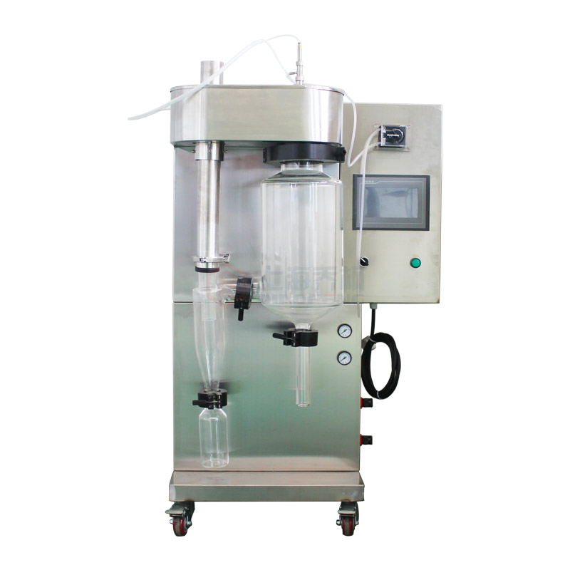 小型 實驗型 微型噴霧干燥機(噴霧干燥儀/噴霧干燥機)及其主要適用于高校、研究所和食品醫藥化工企業實驗室生產微量顆粒粉末,對所有溶液如乳濁液、懸浮液具有廣譜適用性, 適用于對熱敏感性物的干燥如生物制品、生物農藥、酶制劑等,因所噴出的物料只是在噴成霧狀大小顆粒時才受到高溫,故只是瞬間受熱,能保持這些活性材料在干燥后仍維持其活性成份不受破壞。二、實驗型噴霧干燥機特點: