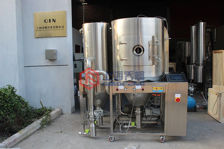 噴霧干燥機是流化技術用于液態物料干燥的一種較好的方法。基本原理是空氣通過過濾器和加熱器,進入干燥塔頂部的空氣分配器,通過熱風分布器的熱空氣呈螺旋狀均勻地進入干燥室。料液由料液貯罐經過濾器由泵或者壓縮空氣送至干燥塔頂的霧化器,使料液噴成極小的霧狀液滴,料液與熱空氣并流接觸,接觸表面積大大增加,水份迅速蒸發,在極短的時間內干燥為成品。成品由干燥塔底部和旋風分離器排出,收集瓶回收,廢氣經濾袋過濾器收集細粉后由風機排出。