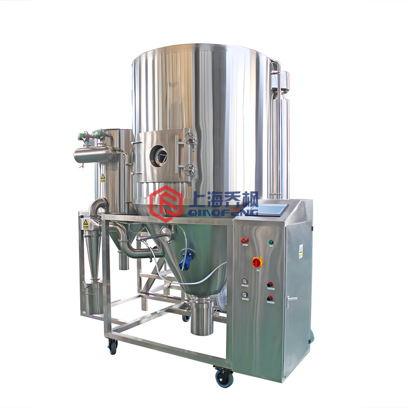 QFN-ZL-E系列造粒噴霧干燥機(喬楓)專門的雙氣送液造粒噴頭,國內一大創新,直接將均勻的球形霧滴通過均勻的熱量變成顆粒。