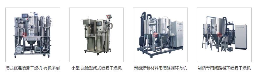 噴霧干燥機(jī)型號(hào)分別為,普通小型噴霧干燥機(jī)、低溫噴霧干燥機(jī)、離心噴霧干燥機(jī)、閉式噴霧干燥機(jī)、噴霧造粒干燥機(jī)、氣流噴霧干燥機(jī)等等。