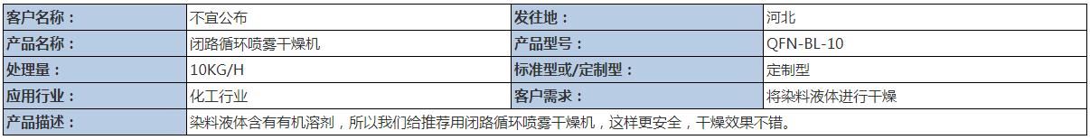 物料屬于:染料液體含有有機(jī)溶劑,所以采用的是我們閉路循環(huán)噴霧干燥機(jī),這樣更安全,干燥效果不錯(cuò),閉路循環(huán)噴霧干燥機(jī)也可稱為:有機(jī)溶劑噴霧干燥機(jī)或閉式循環(huán)噴霧干燥機(jī)等。